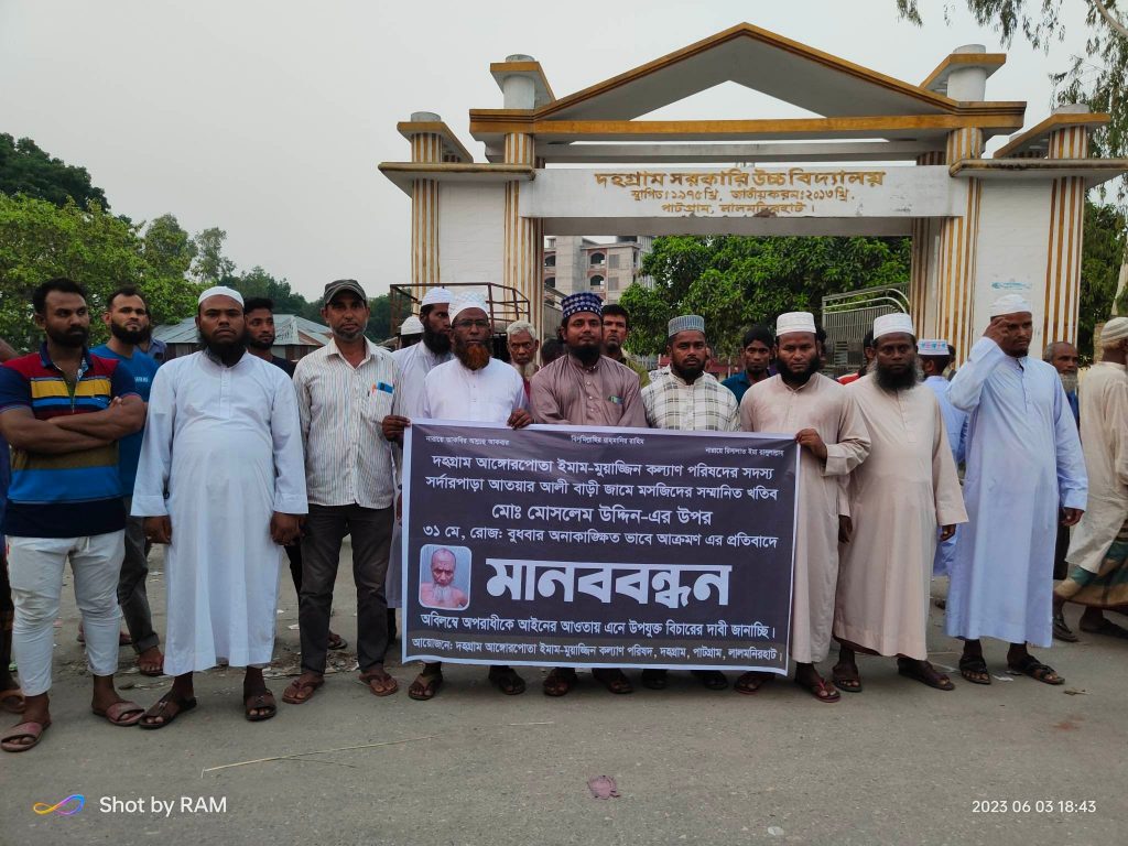 এর প্রতিবাদে, দহগ্রাম ইমাম মুয়াজ্জিন কল্যাণ পরিষদের আয়োজনে ০৩ই জুন,২০২৩ ইং বিকাল ৪.০০ ঘটিকা থেকে বিকাল ৫.০০ ঘটিকা পর্যন্ত দহগ্রাম বঙ্গেরবাড়ি বাজারে মানববন্ধন কর্মসূচী পালন করেন সংগঠনটির নেতৃবৃন্দ, সর্দারপাড়া আতোয়ার আলী মুন্সি জামে মসজিদের কমিটির নেতৃবৃন্দ ও মুসল্লী বৃন্দ।