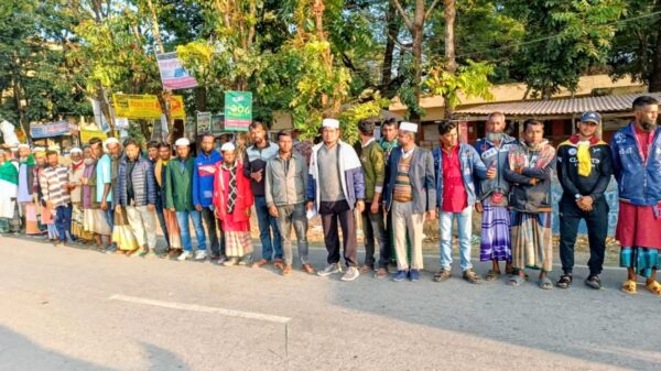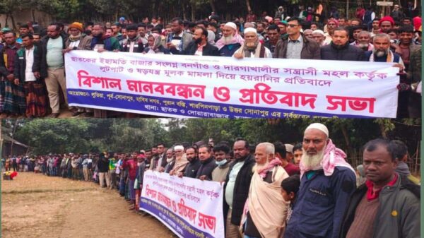 কোম্পানীগঞ্জ প্রতিনিধিঃ ছাতক ও দোয়ারাবাজার উপজেলার সীমান্তবর্তী এলাকায় সন্ত্রাসী কার্যক্রম, দোকানপাট লুট, গবাদিপশু ও ফসল ছিনতাই এবং ষড়যন্ত্রমূলক মামলায় নিরীহ মানুষকে হয়রানির প্রতিবাদে মানববন্ধন অনুষ্ঠিত হয়েছে। সোমবার (২৯ ডিসেম্বর) দুপুরে দোয়ারাবাজার উপজেলার নরসিংপুর ইউনিয়নের পূর্ব