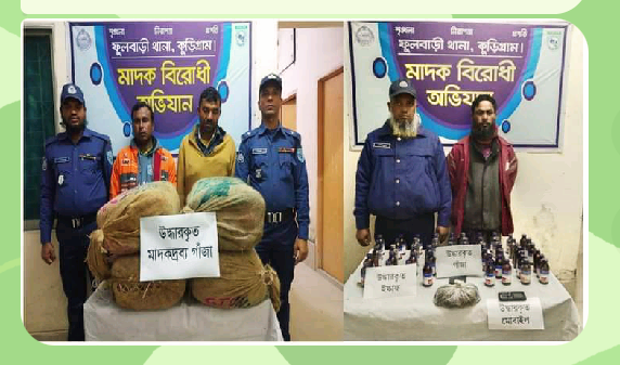 এইচ এম বাবুল জেলা প্রতিনিধি কুড়িগ্রামঃ-১৪ জানুয়ারি শনিবার কুড়িগ্রামের ফুলবাড়ীতে পৃথক দুইটি অভিযানে ৫২ কেজি গাঁজা ও ৫৩ বোতল ইস্কাফ উদ্ধার সহ ৩ জন কুখ্যাত মাদক কারবারিকে গ্রেফতার করেছে থানা পুলিশ।ফুলবাড়ী থানা পুলিশ কর্তৃক গতকাল