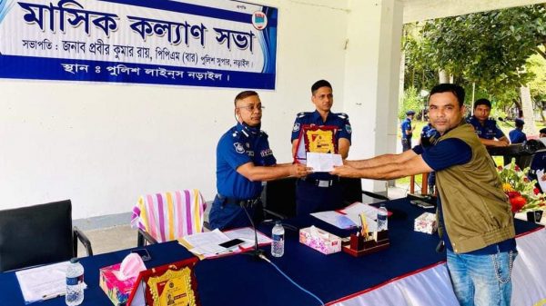 মির্জা মাহামুদ হোসেন রন্টু নড়াইলঃআজ বৃহস্পতিবার ২৮ জুলাই সকালে নড়াইল জেলা পুলিশের আয়োজনে পুলিশ লাইন্স ড্রিলসেডে মাসিক কল্যাণ সভা অনুষ্ঠিত হয়। উক্ত সভায় সভাপতিত্ব করেন জনাব প্রবীর কুমার রায়, পিপিএম (বার), পুলিশ সুপার(অতিরিক্ত ডিআইজি পদে