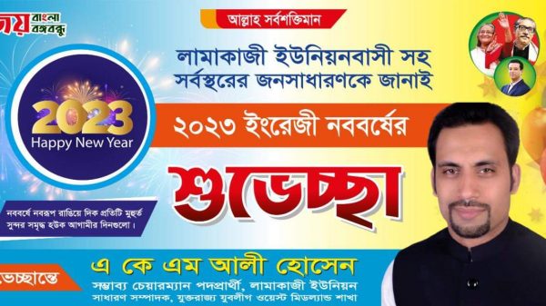 বিশ্বনাথ প্রতিনিধিঃ ইংরেজি নতুন বছরের (২০২৩) শুরুতে বিশ্বনাথ উপজেলার লামাকাজী ইউনিয়নবাসী সহ দেশ বিদেশের সকলকে শুভেচ্ছা ও অভিনন্দন জানিয়েছেন যুক্তরাজ্যে বসবাসরত বাঙালি কমিউনিটি নেতা এ কে এম আলী হোসেন।লামাকাজী ইউনিয়নের কৃতিসন্তান, উদীয়মান সমাজ সেবক, লামাকাজী ইউনিয়ন