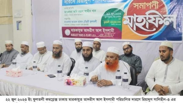 মামুনুর রশীদঃ ফুলতলী কমপ্লেক্স ঢাকায় মারকাযুত তাদরীস আল ইসলামী কর্তৃক আয়োজিত ২০ দিনব্যাপী ‘দারসে রিয়াদুস সালিহীন-৩’ এর সমাপনী মাহফিল সম্পন্ন হয়েছে। বৃহস্পতিবার (২২ জুন ২০২৩) বাদ এশা কমপ্লেক্স এর সেমিনার হলে এ অনুষ্ঠান সম্পন্ন হয়।