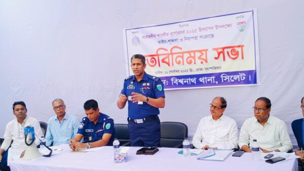বিশ্বনাথ প্রতিনিধি আসন্ন শারদীয় দুর্গোৎসব উপলক্ষে সিলেটের বিশ্বনাথে থানা প্রশাসনের উদ্যোগে ‘আইন শৃঙ্খলা ও নিরাপত্তা সক্রান্তে’ মতবিনিময় সভা অনুষ্ঠিত হয়েছে। বৃহস্পতিবার (১১ সেপ্টেম্বর) বিকেলে থানা কমপাউন্ডে অনুষ্ঠিত মতবিনিময় সভায় প্রধান অতিথির বক্তব্য রাখেন সিলেট জেলা