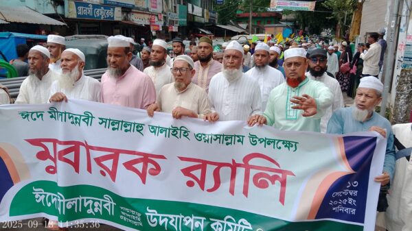 বিশ্বনাথ (সিলেট) প্রতিনিধি: শত-শত সুন্নি জনতার উপস্থিতিতে সিলেটের বিশ্বনাথ উপজেলার পৌর শহরে মিলাদুন্নবী (সাঃ) মুবারক র্যালী অনুষ্ঠিত হয়েছে। শনিবার (১৩ সেপ্টেম্বর) দুপুরে বিশ্বনাথ পৌর শহরে ঈদে মিলাদুন্নবী (সাঃ) উদযাপন কমিটি বিশ্বনাথের উদ্যোগে উক্ত মুবারক র্যালীটি