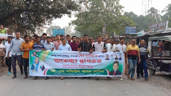 আল-হুদা মালী শ্যামনগর থেকেঃ খুলনায় প্রধানমন্ত্রী ও আওয়ামী লীগ সভানেত্রী শেখ হাসিনা’র আগমন উপলক্ষে শ্যামনগরে আনন্দ শোভাযাত্রা অনুষ্ঠিত হয়েছে । আগামী ১৩ নভেম্বর মাননীয় প্রধানমন্ত্রী ও আওয়ামী লীগের সভানেত্রী জননেত্রী শেখ হাসিনা’র খুলনায় আগমন উপলক্ষে