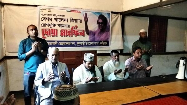 জেলা প্রতিনিধি কুড়িগ্রাম কুড়িগ্রামের ফুলবাড়ীতে বিএনপির চেয়ারপারসন ও সাবেক প্রধানমন্ত্রী বেগম খালেদা জিয়ার রোগমুক্তি ও সুস্থতা কামনায় দোয়া মাহফিল অনুষ্ঠিত হয়েছে। রোববার (০১ ডিসেম্বর) দুপুর ২টায় উপজেলা প্রেস ক্লাব মিলনায়তনে উপজেলা সেচ্ছাসেবক দলের উদ্যোগে এ